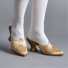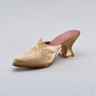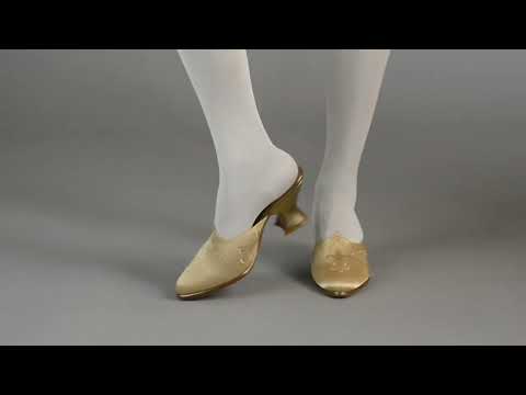 Charlotte 18th century mules blend history and fantasy in an opulent and sophisticated 18th century satin mule. Correct for c. 1700 - 1770s, these elegant backless heeled slippers feature a superbly balanced gold French heel, leather lining for easy walking, and a softly pointed toe. Pair Charlotte with your best Georgian gown, or with your everyday wardrobe to add a touch of luxury!