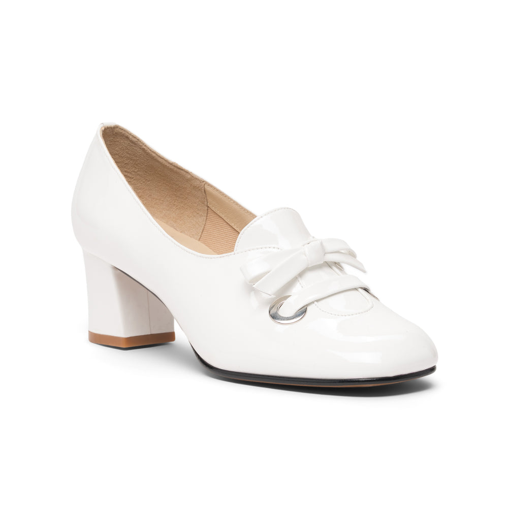 Welcome to the '60s! Pattie is our fab, far out, and first ever 1960s reproduction shoe. These cool slip-on pumps feature a custom, 1960s reproduction 2"/5.08 cm block heel, squared-off round toe, and a definitive and detailed 1960s shape, thanks to our new custom last. Based on period originals, Pattie has a fixed tie detail over the toe, as well as chunky '60s grommets. Choose from uppers in mid-century metallics or mod patent leathers. Pattie is available in both standard and wide. Note: patent leather is easily cleaned by wiping gently with a microfiber or damp cloth. We recommend against using water repellant sprays, waxes, or lustre creams.