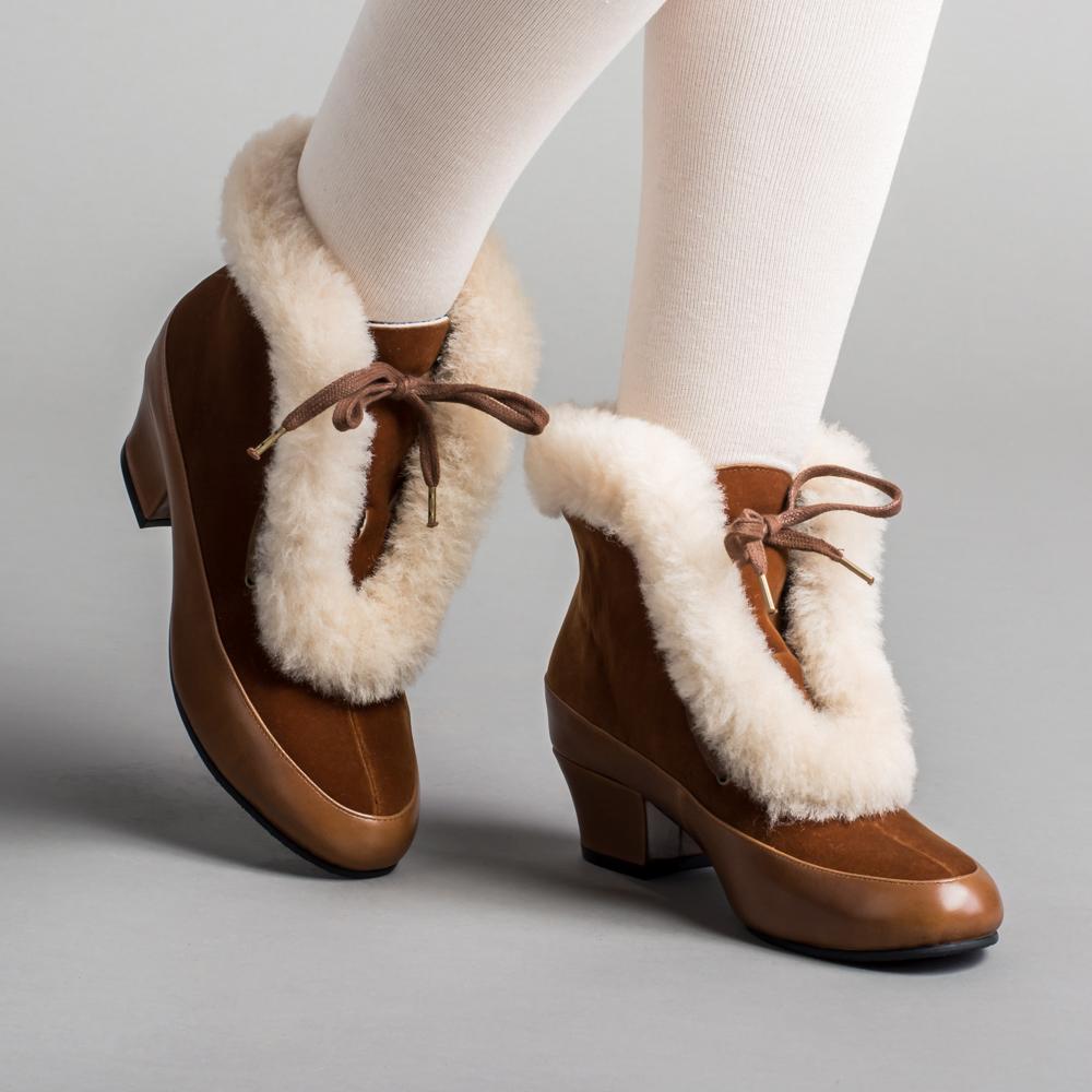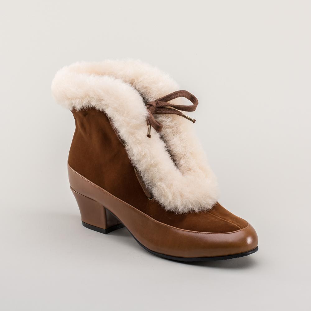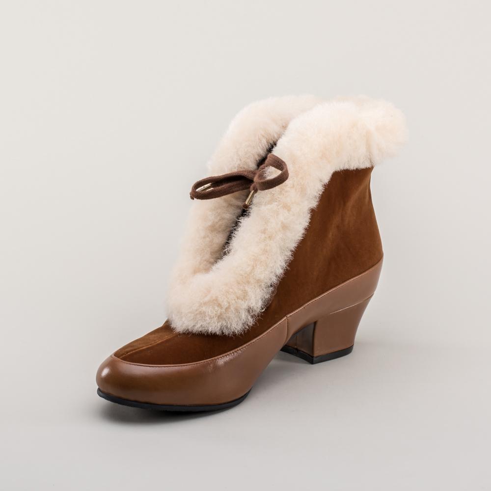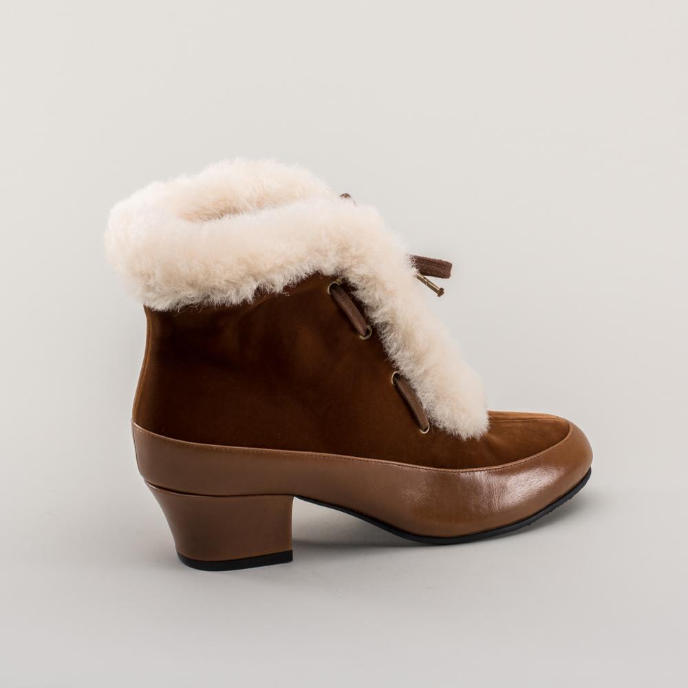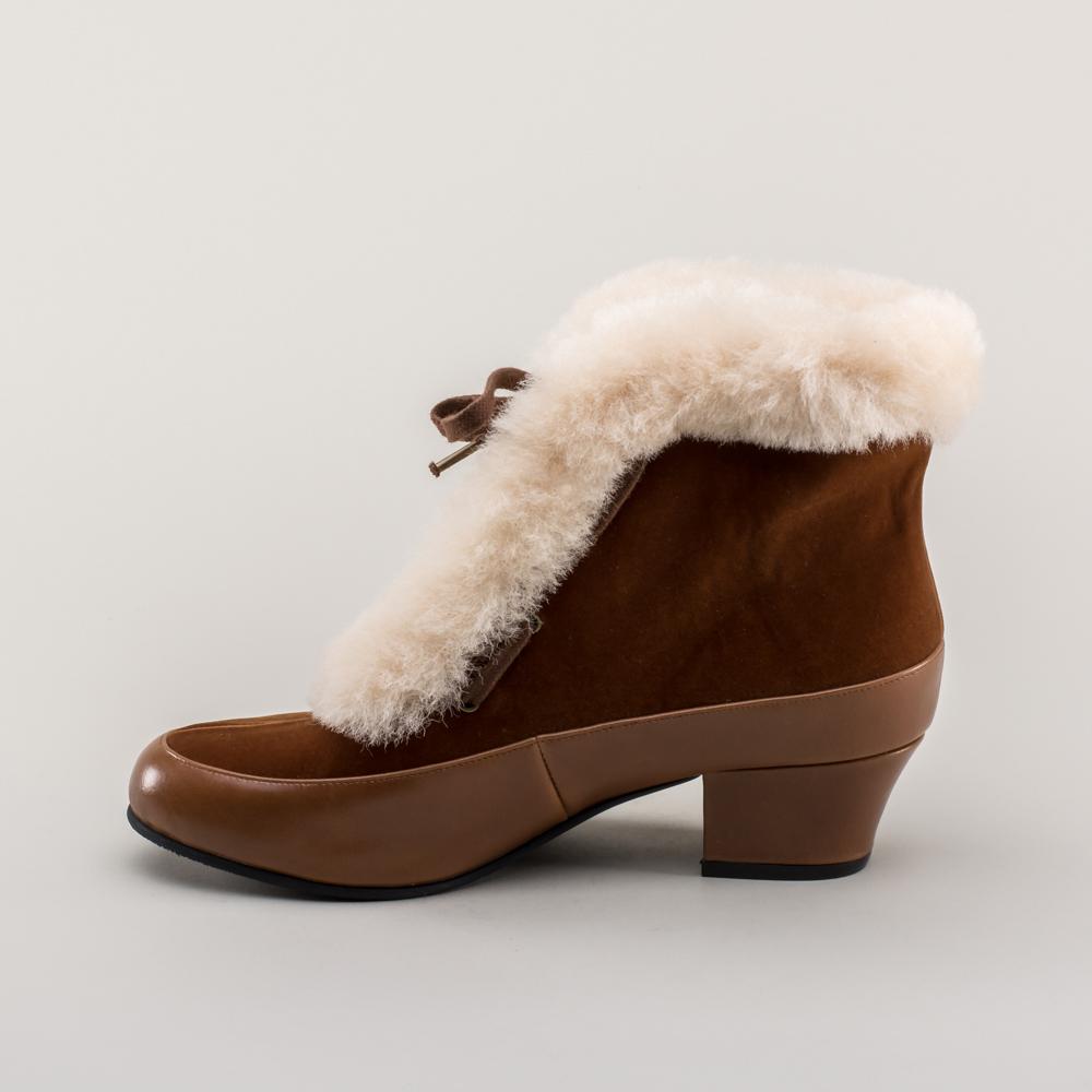 Alpen Retro Winter Booties are just the fashionable footwear you need for your winter vintage outfits. These booties are based on original Montgomery Ward overshoes, also known as galoshes, but are made as regular boots. We've stayed faithful to the velveteen upper and houndstooth lining, opting to use ethically sourced sheepskin trim and leather foxing and heel. These beautiful boots are cozy and practical for winter wear, with rubber soling.