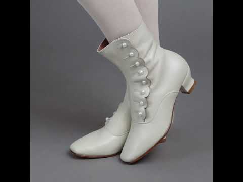 These mid-Victorian and Bustle Era boots have square toes, a short heel molded from an original, and an attractive scalloped edge and top, making them practical yet feminine, and ideal for a fashionable Victorian lady.