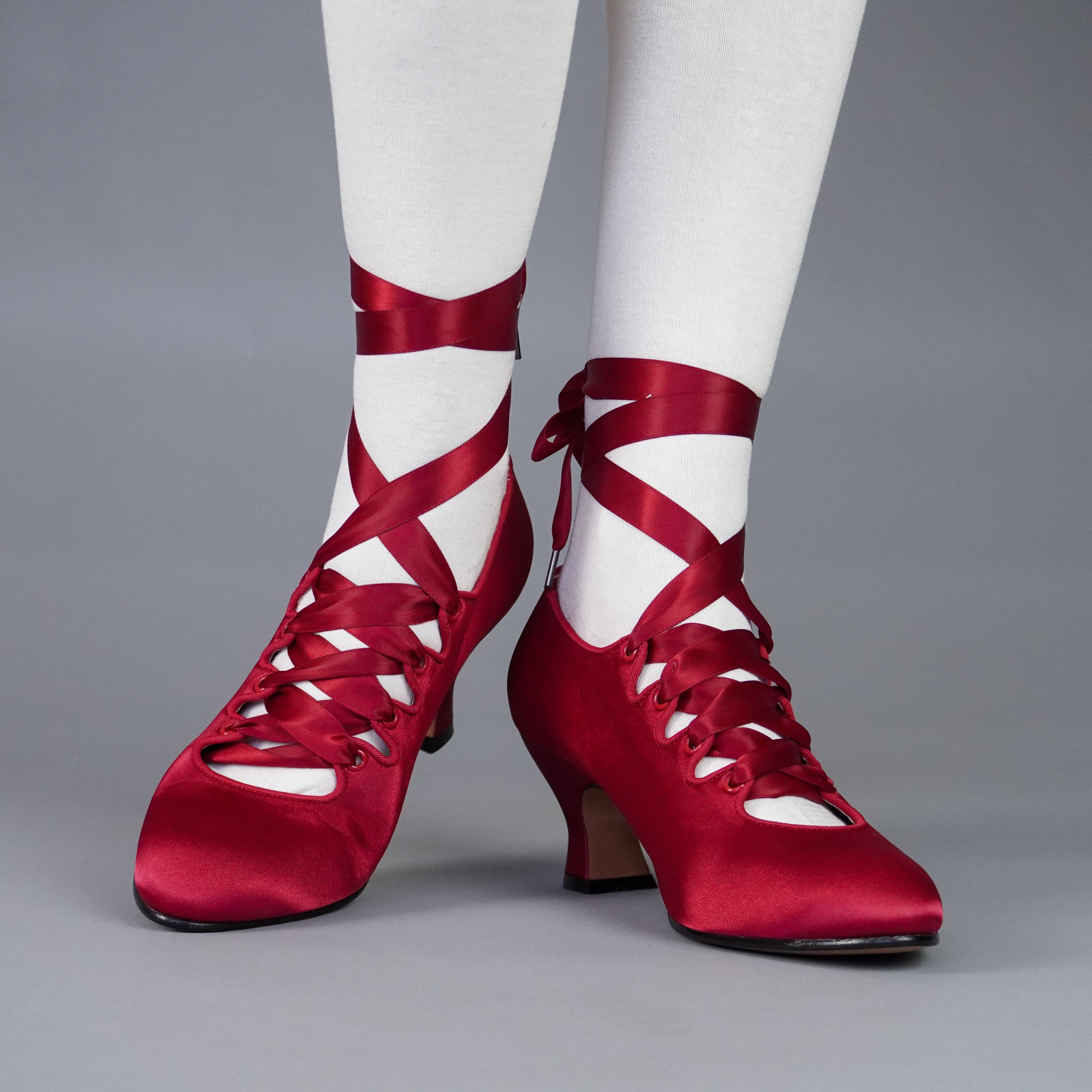 Embody the height of 1910s fashion with these gorgeous Foxtrot pumps! Accurate to 1910 through the 1920s, Foxtrot is based on the oh-so in vogue lace-up shoes of the late Edwardian era. Foxtrot features perfectly balanced, custom 2.5"/6.3 cm French heels, almond-shaped toes, and sleek satin uppers. Serpentine tabs laced with double-faced satin ribbons make this curvy pump one-of-a-kind. Foxtrot comes with two sets of ribbon laces, for adjustable sizing. Wear them with historical costumes, contemporary evening-wear, Lolita coords, or your favorite dress for a touch of glamour.