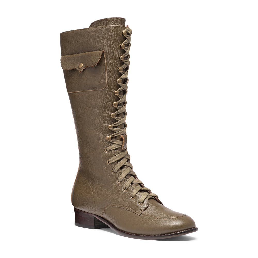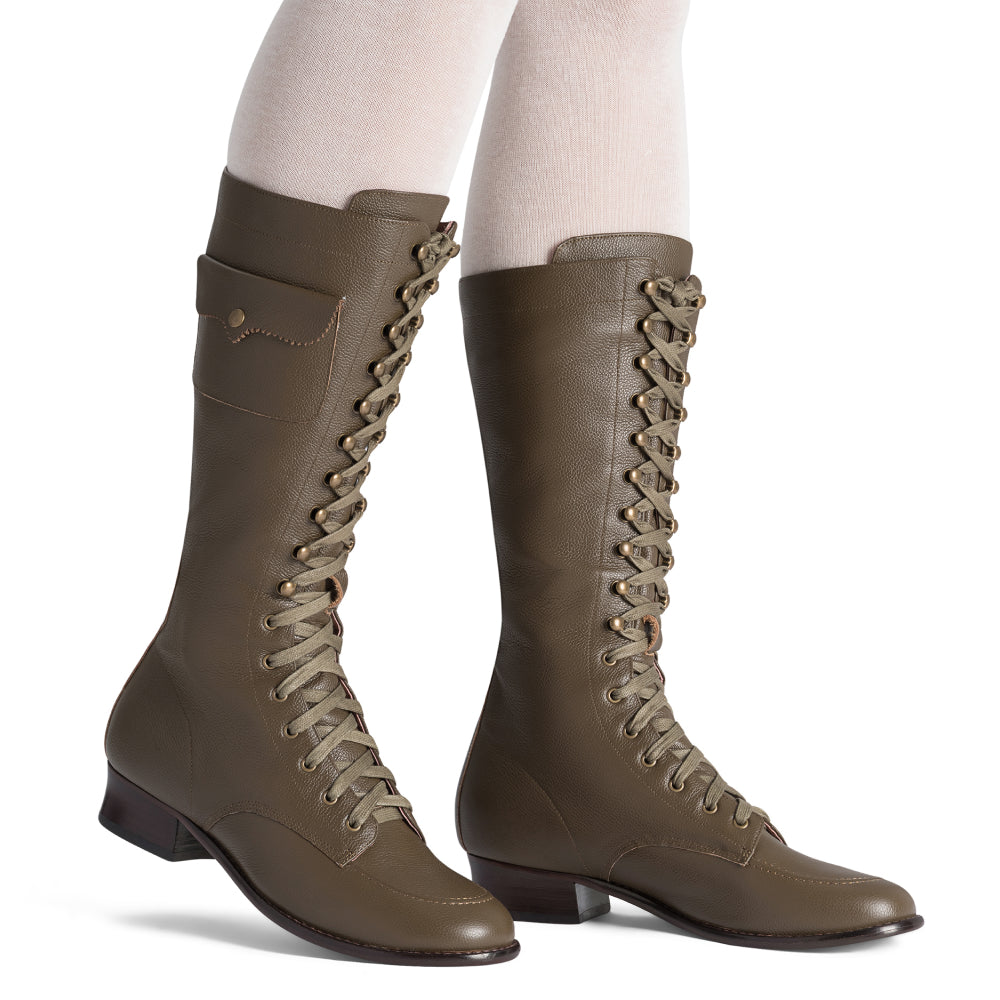 Onward to adventure in the stunning reproduction Bessie Vintage Aviator Boots! These beautiful all-leather boots are carefully recreated from two pairs of original 1930s women's sporting boots right down to the nifty side pocket. We've named these vintage reproduction boots after Bessie Coleman, the first Black and Indigenous American woman to hold a pilot's license. Bessie traveled to France in 1920, learning to fly a Nieuport 564 biplane, and earning her aviation license from the Fédération Aéronautique Internationale. Returning to the USA, she became an acclaimed daredevil pilot in airshows, earning the nicknames "Queen Bess" and "Brave Bessie," and inspiring generations of Black and Indigenous women in aviation to this day. Bessie Boots are perfect for adventures from the Great War period through the 1920s, 30s, 40s, and 50s. This style of boot was popular and well-loved. Wear them for numerous cosplays, Land Girl, motorcycling, and aviator costumes, for riding, working, and hiking, with breeches or skirts, historic or modern. As a lace-up boot, Bessies are very adjustable for a wide variety of ankle and calf measurements. The top of the Bessie boots do reach the calf muscle, and we've designed this area to be particularly adjustable for a broad range. Bessie comes with two sets of laces, for increased adjustability. Measurements below are based on size 8, and scale slightly based on size. Calf size range : 14 - 19.5 in / 35.6 - 49.5 cm Shaft height (does not include heel): 12.5 in / 31.7 cm