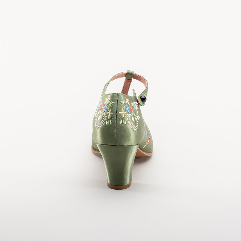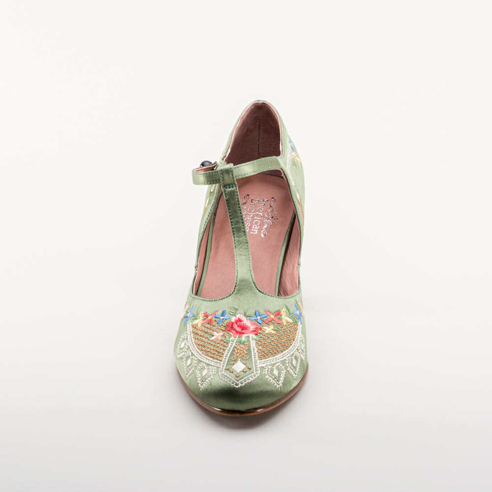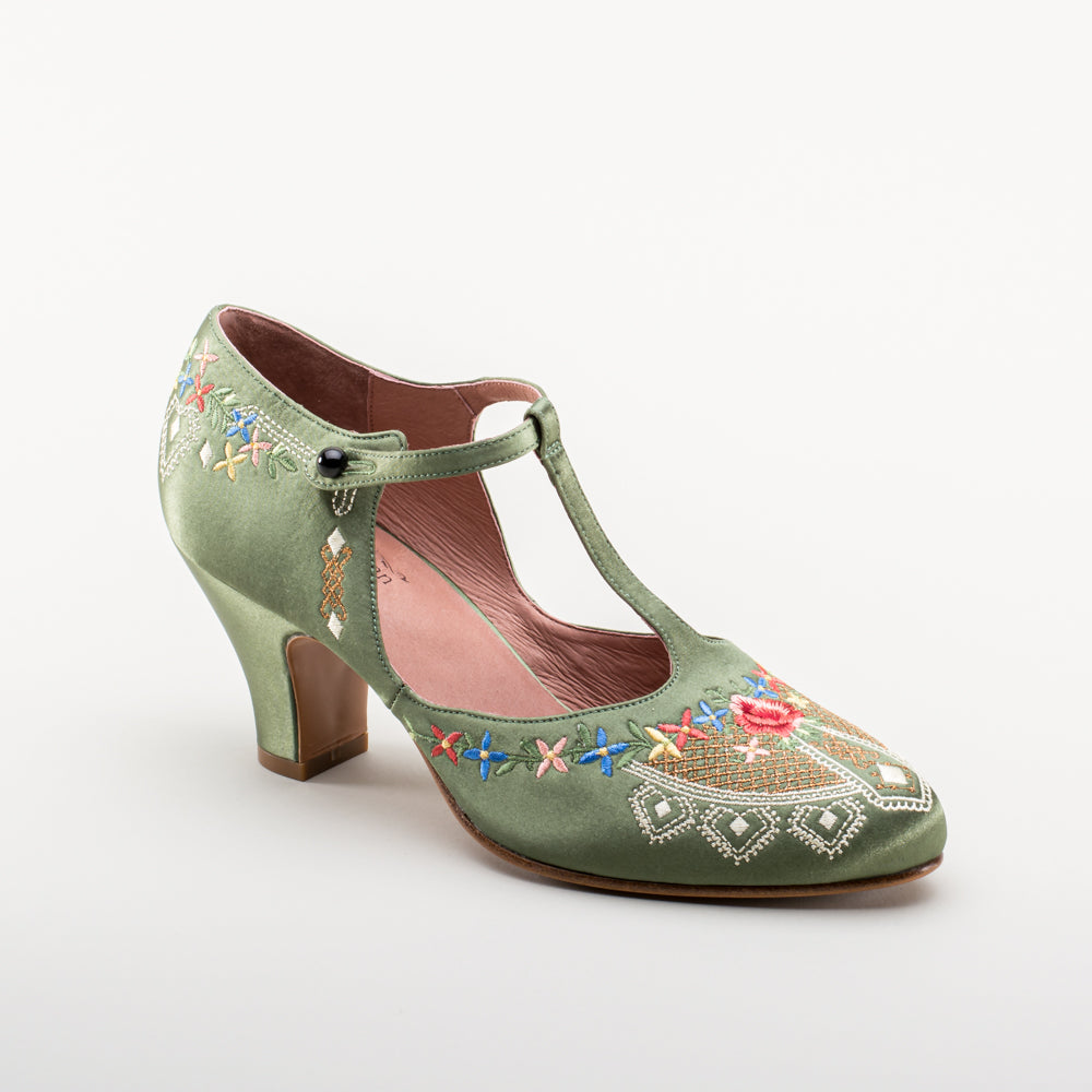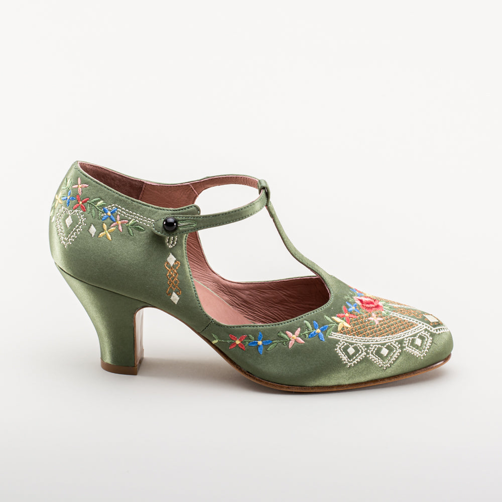 As hemlines rose in the 1920s, flashy footwear was all the rage, and the Daisy Embroidered T-Strap heels are just the ticket. Made in luminous satin heavily embroidered in a gorgeous botanical design, the Daisy T-Strap Shoes are closely based on an original pair in Bata Shoe Museum. These gorgeous shoes are accurate for the 1920s, 1930s, and 1940s, and offer our refined and stable 2.5 in / 6.3 cm Spanish heel paired with open sides and an almond toe.