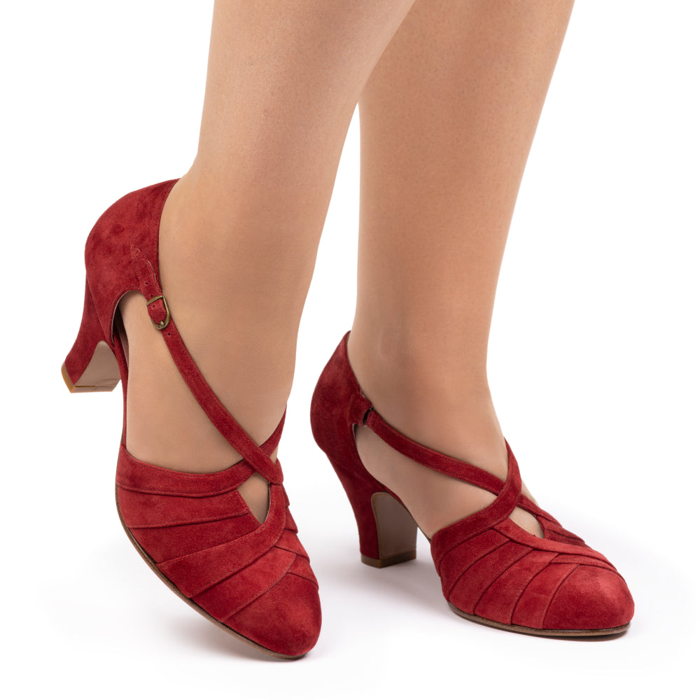 Looking for a shoe that combines the glamour of old Hollywood and all-day wearability? Look no further than Melrose! Based on period originals, these beautiful pumps capture the silhouette and style of the 1930s with sleek straps criss-crossed over the instep, a keyhole opening over the vamp, and gorgeous leather piecing. The straps feature hidden elastic inserts, for additional comfort and ease. Melrose features our classic 2.5"/ 6.35 cm Spanish heel, which is perfectly balanced for comfort. Whether you're donning daywear or evening wear, Melrose fits the occasion.