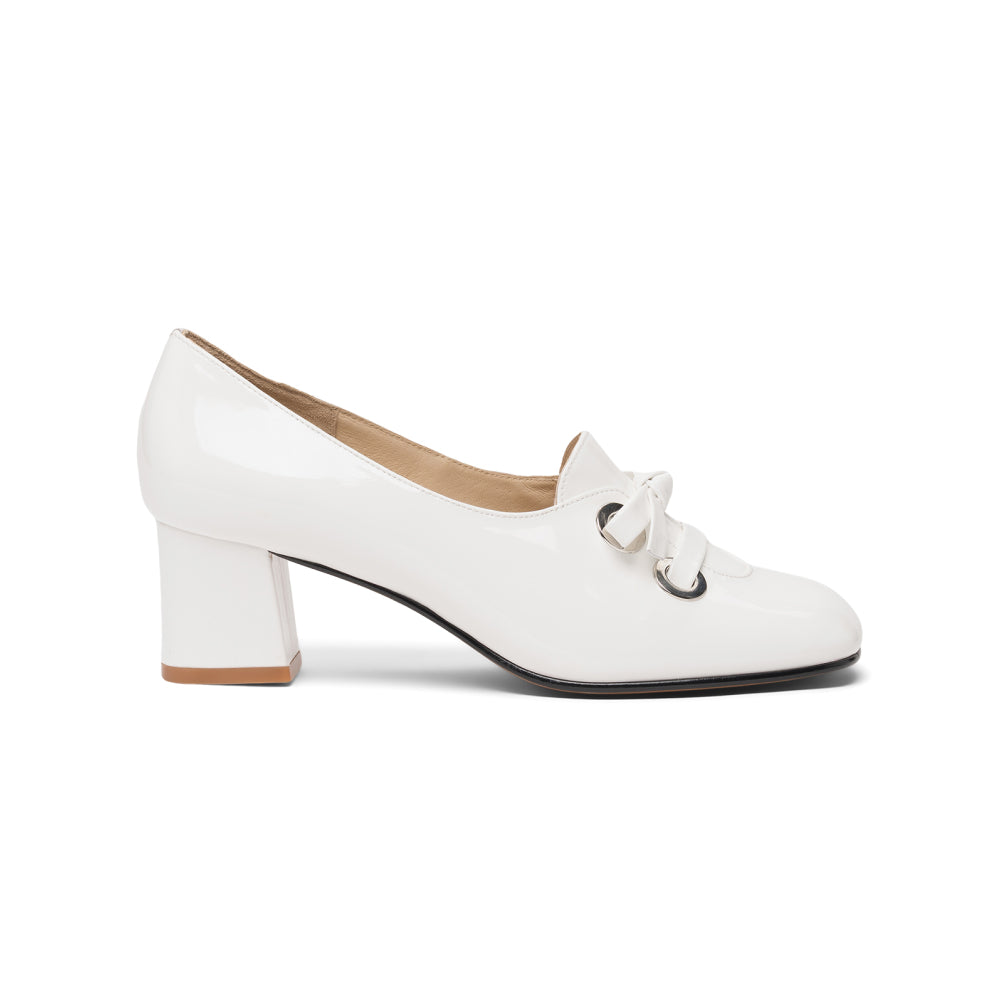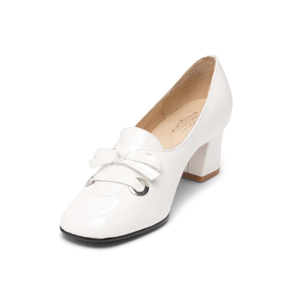 Welcome to the '60s! Pattie is our fab, far out, and first ever 1960s reproduction shoe. These cool slip-on pumps feature a custom, 1960s reproduction 2"/5.08 cm block heel, squared-off round toe, and a definitive and detailed 1960s shape, thanks to our new custom last. Based on period originals, Pattie has a fixed tie detail over the toe, as well as chunky '60s grommets. Choose from uppers in mid-century metallics or mod patent leathers. Pattie is available in both standard and wide. Note: patent leather is easily cleaned by wiping gently with a microfiber or damp cloth. We recommend against using water repellant sprays, waxes, or lustre creams.