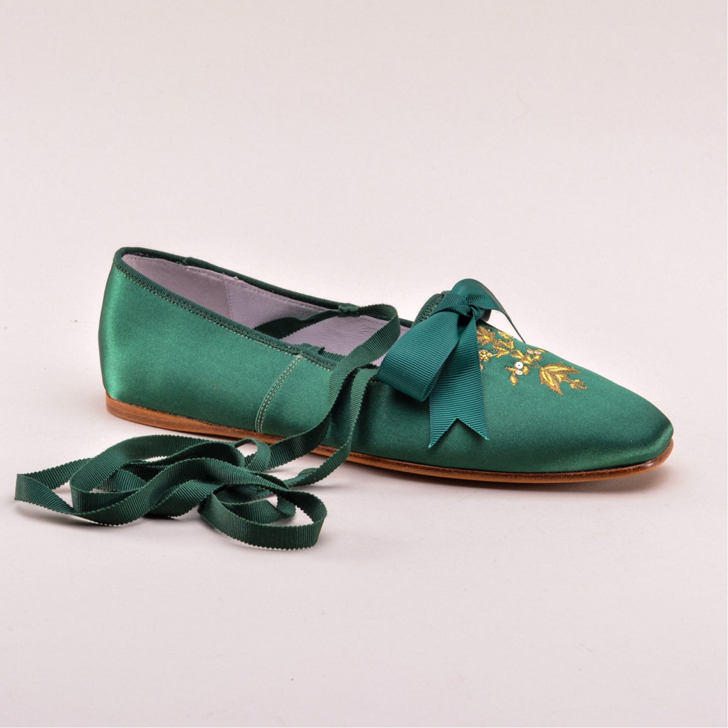 These slip-on shoes are accurate for c. 1800 - 1830. They feature a beautiful satin upper embroidered with a historical design on the vamp, complete with spangles. The edges are bound in petersham, with matching optional ankle ribbons and vamp bow which is easily removed. Period-correct turnshoe construction, soft square toe, and real leather soles make the Penelopes unmatched for evening and formal events where the prettiest of shoes are required. Wear them for Jane Austen, Napoleonic, War of 1812, and all Regency events.
